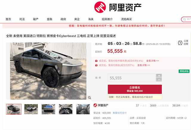 拍卖平台显示,开拍日期为6月25日19:00,起拍价55555元,保证金2万。目前该车已有3万多人围观,数十人报名。
